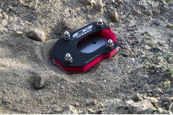 The extension prevents the motorcycle from collapsing on soft ground when parked on the side stand. Made entirely of stainless steel and ABS/ASA, which stabilizes the stock footing inside.