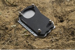 The extension prevents the motorcycle from collapsing on soft ground when parked on the side stand. Made entirely of stainless steel and ABS/ASA, which stabilizes the stock footing inside.