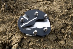 The extension prevents the motorcycle from collapsing on soft ground when parked on the side stand. Made entirely of stainless steel.